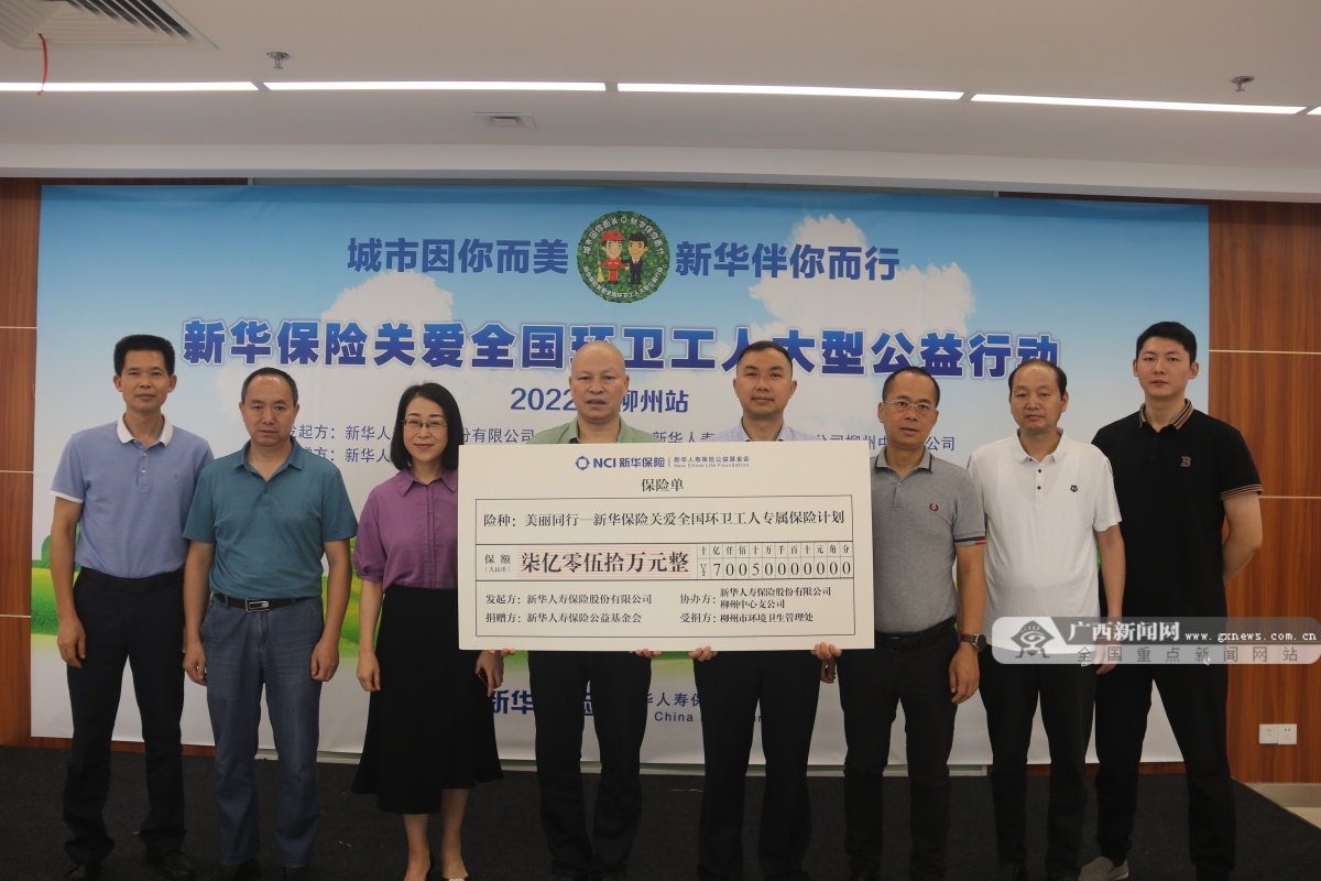 新华保障为柳州市区7005名环卫工人赠送人身无意危害保障保护,各级头领与保障单合影。新华保障广西分公司 供图